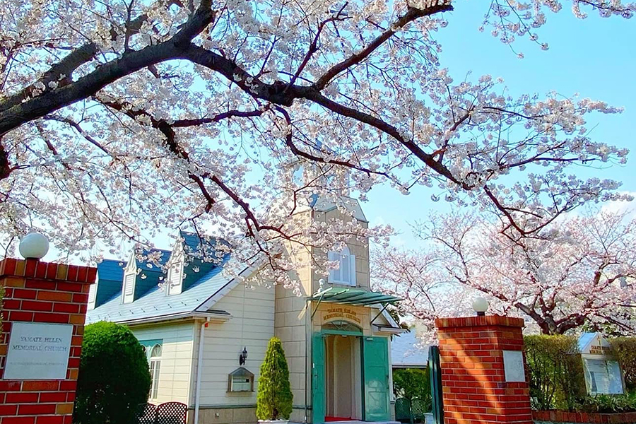 山手ヘレン記念教会の桜が見頃を迎えています