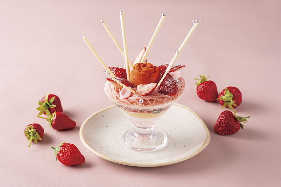 桜ゼリーや北海道産純生クリーム、カスタードやミックスベリーを重ね苺のモンブランクリームをのせた春らしいローズパフェ。